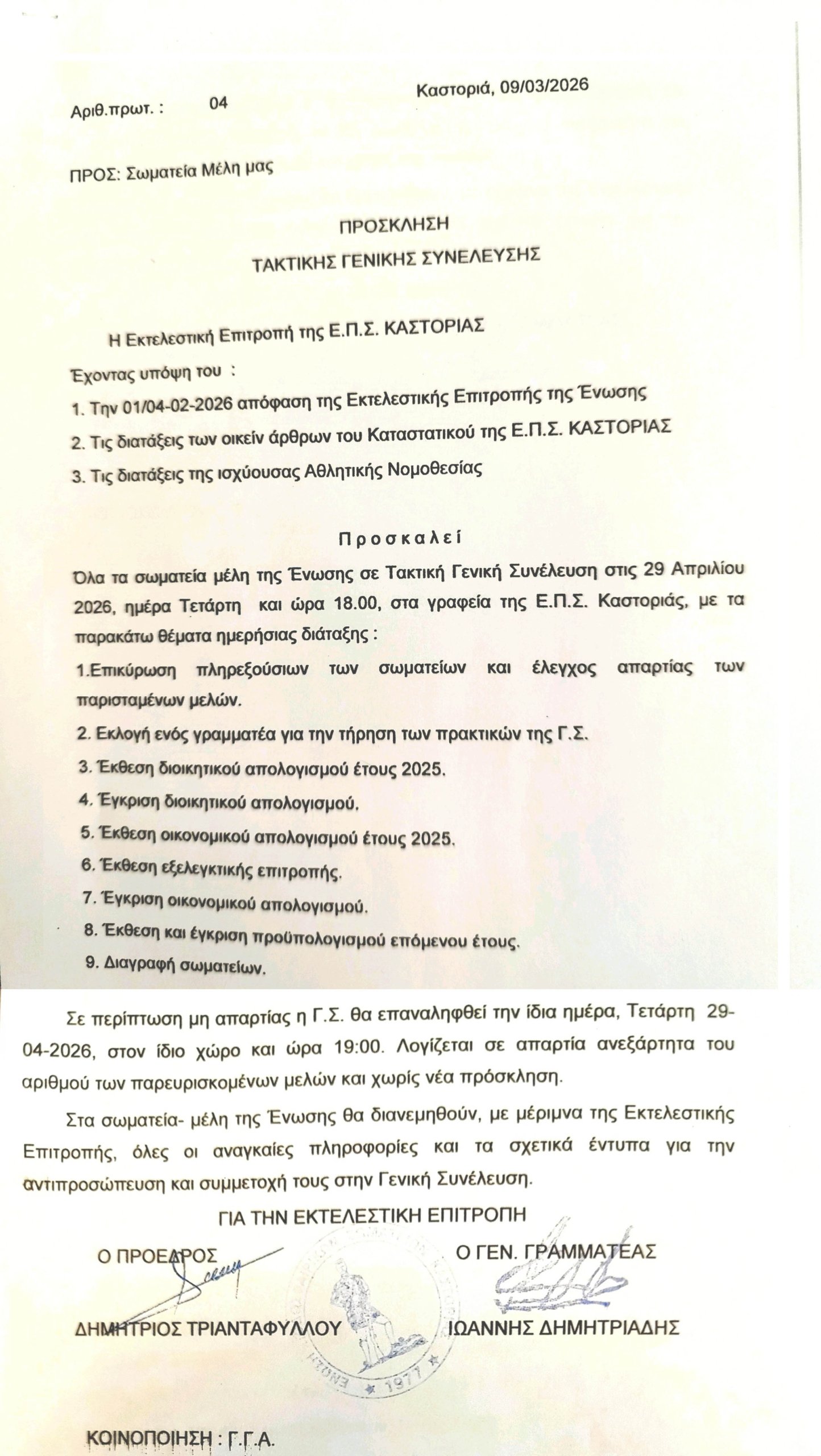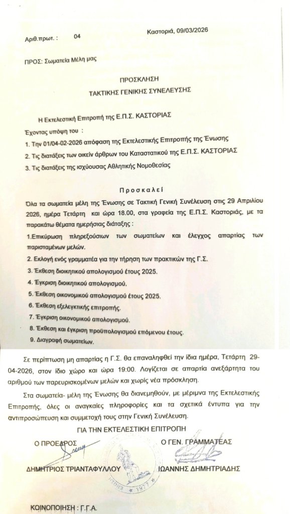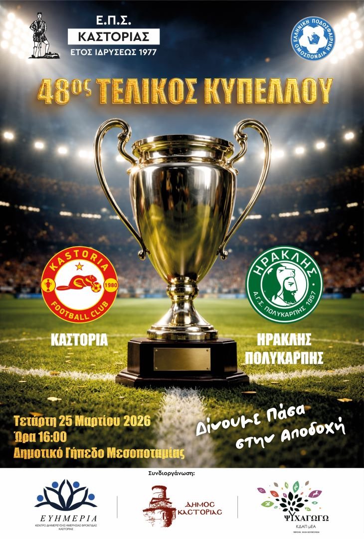 Η Επιτροπή Πρωταθλήματος και Κυπέλλου της Ε.Π.Σ. Καστοριάς ενημερώνει ότι ο 48ος Τελικός Κυπέλλου της Ένωσης θα διεξαχθεί την Τετάρτη 25 Μαρτίου 2026 και ώρα…
